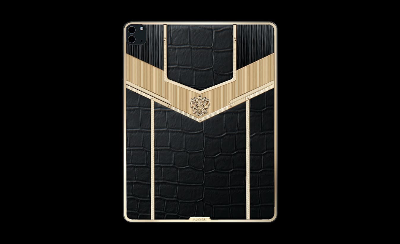 Планшет iPad Pro (2022) «Патриот» получил уникальное сочетание черной крокодиловой кожи, 24-каратного золота и гравировки с российским гербом.