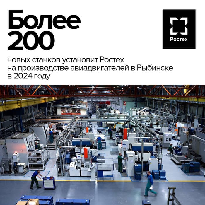 Ростех в 2024 году планирует установить более 200 новых станков на двигателестроительном предприятии в Рыбинске. Завод получил 30 единиц высокотехнологичного современного оборудования. Специалисты уже используют уникальный российский комплекс лазерной резки и сварки деталей авиадвигателей. Он необходим для обработки рабочих и сопловых лопаток двигателей. Ожидается открытие цеха с токарно-фрезерным станочным парком.