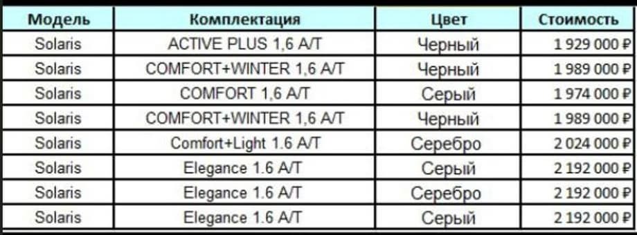 По информации телеграм-канала «Автопоток», цены на машины с АКПП будут варьироваться от 1 929 000 до 2 192 000 рублей. Таким образом, новые двухпедальные «Солярисы» оказались дороже, чем Lada Vesta с вариатором. За седан от «АвтоВАЗа» со 122-сильным двигателем объёмом 1,8 литра просят от 1 588 900 до 1 885 900 рублей. Такие цены «АвтоВАЗ» опубликовал на своём сайте. Не исключено, что у дилеров Lada Vesta будет ещё дороже.