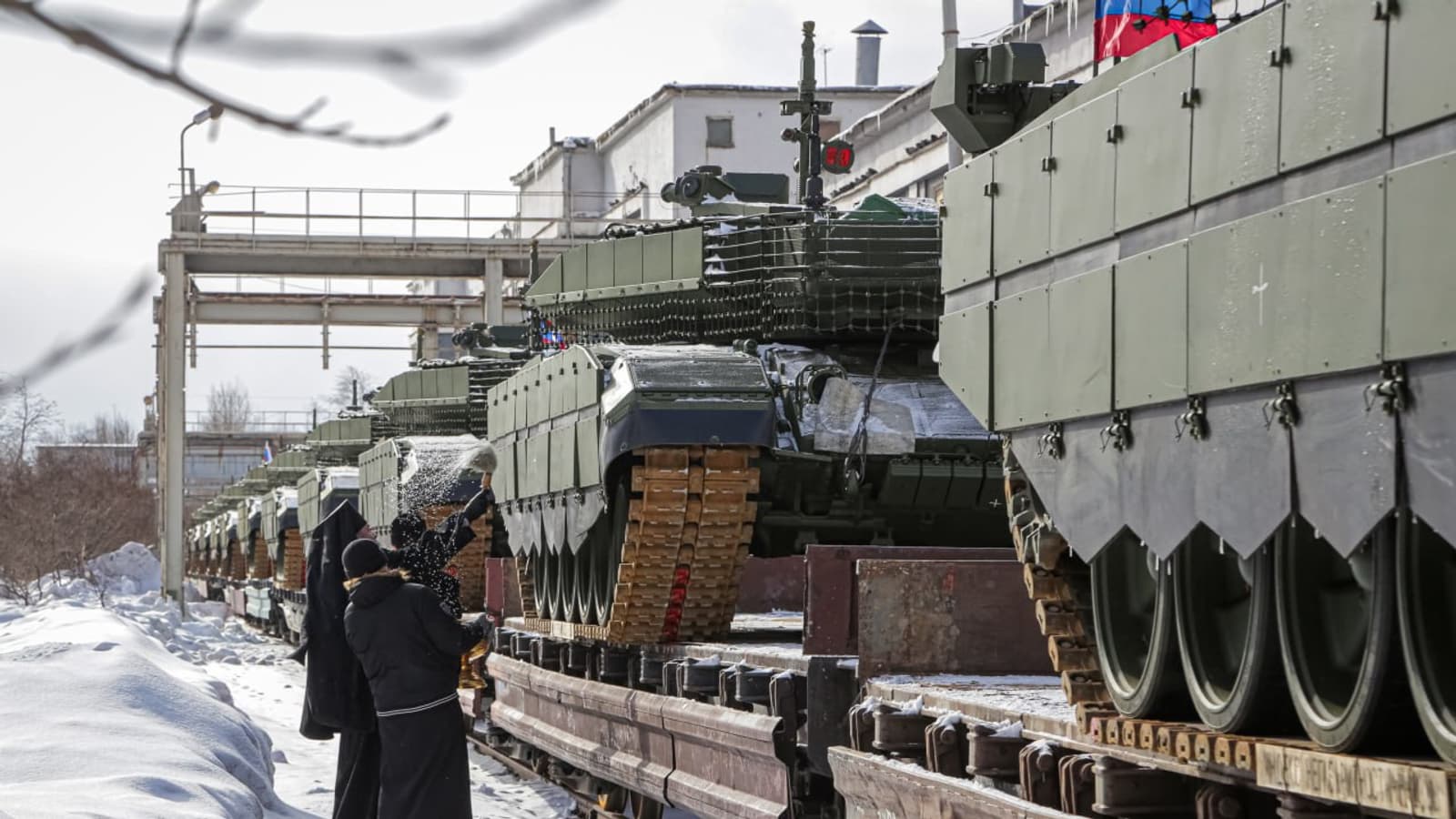 Танки Т-90М по традиции освятил епископ Нижнетагильский и Невьянский Феодосий. После этого эшелон двинулся в сторону места дислокации российских военнослужащих.
