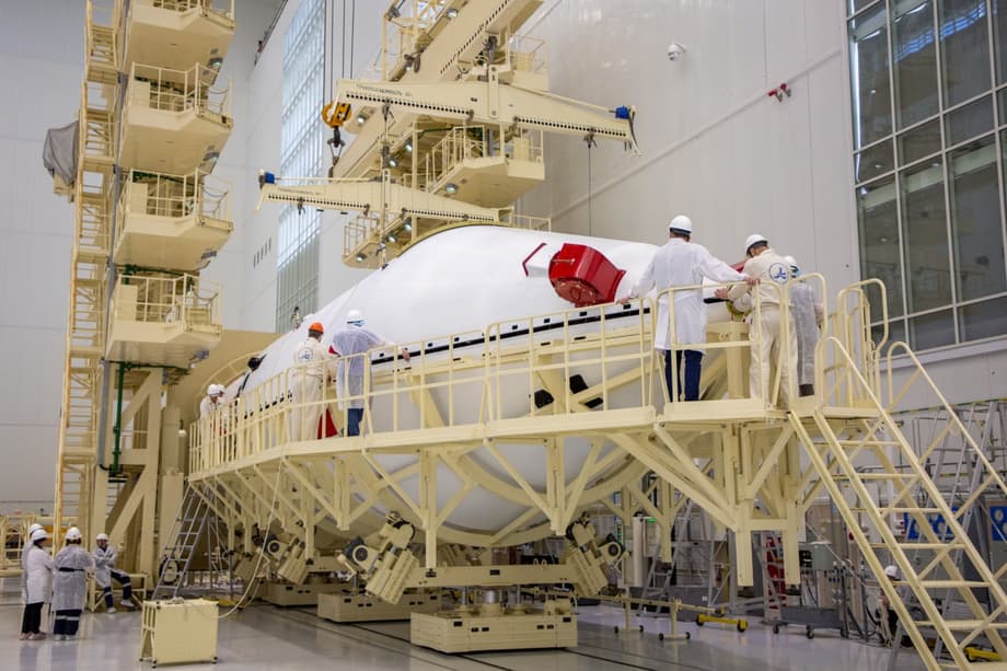 Специалисты «Роскосмоса» выполнили кантование сборки, подвод створок головного обтекателя, а затем их накатку на разгонный блок «Орион» и полезную нагрузку. После сборки конструкцию подвергли пневмопроверкам и электропроверкам, и никаких замечаний не выявили.