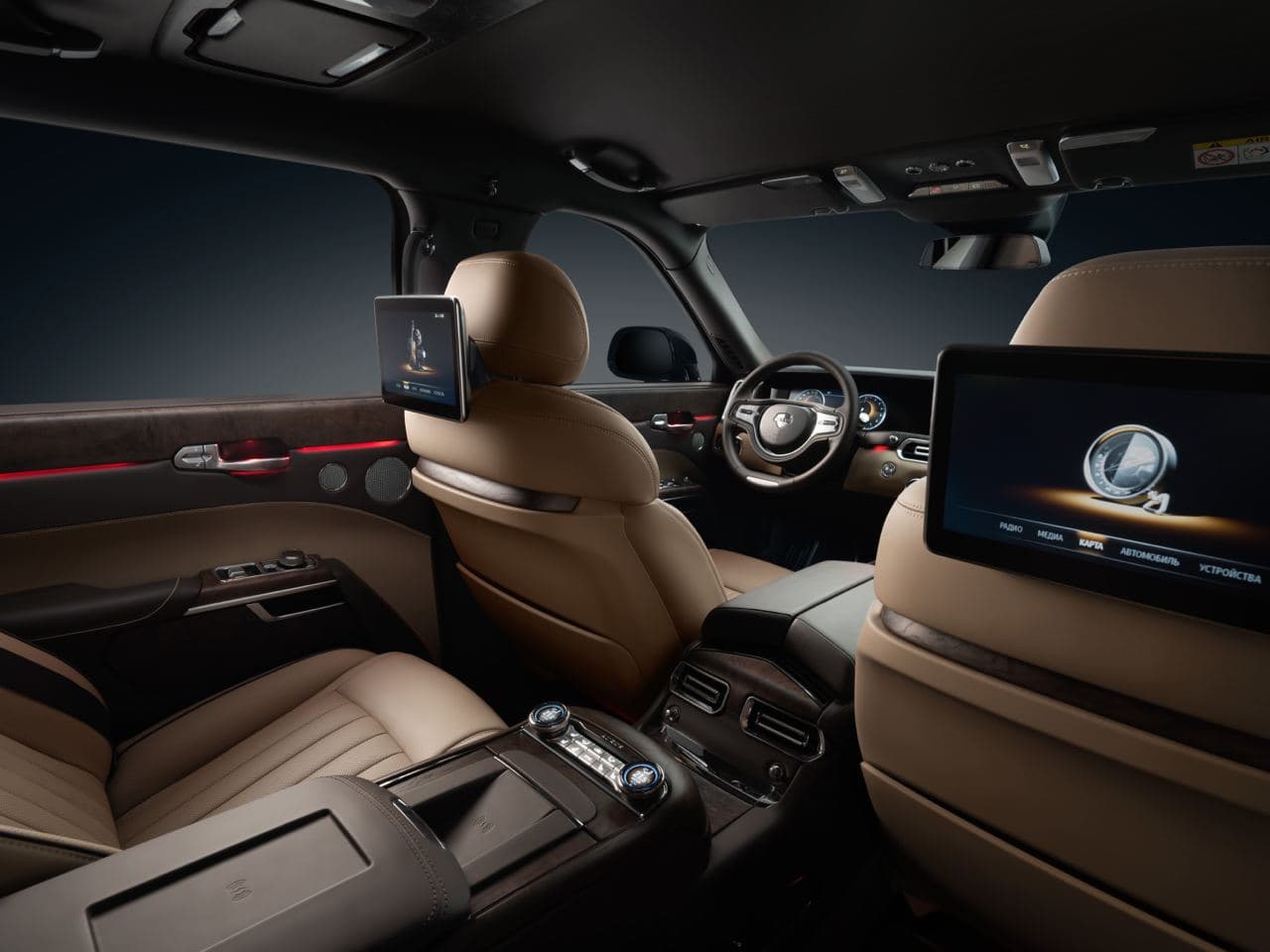 Он также найдет здесь мультимедийную развлекательную систему. Внутри установлены ЖК-экраны, поэтому картинка красивая и динамичная. Разработчики предпочли отказаться от сенсоров в пользу привычных тумблеров. Черненко не исключил, что в будущем в массовых моделях Aurus появится сенсорное управление.