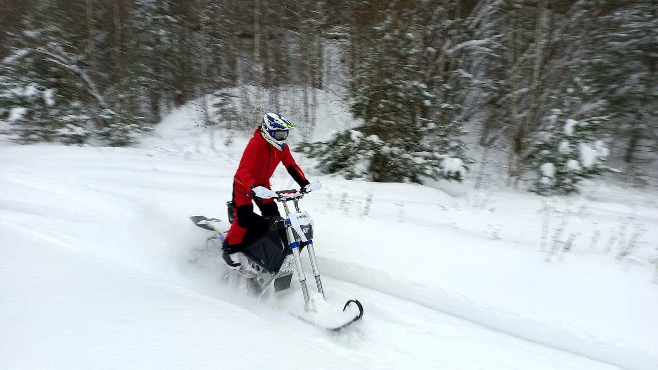 «Сердцем» электросноубайка служит фирменная трансмиссия с электродвигателем до 25 кВт. Запас хода стандартной батареи на 4 кВт/ч с зарядным устройством мощностью 2 кВт составляет два часа езды, или 40 километров. Батареи при этом за дополнительную плату могут быть установлены на 6, 8 и 10 кВт/ч с заменой зарядного устройства на устройство мощностью 4кВт.