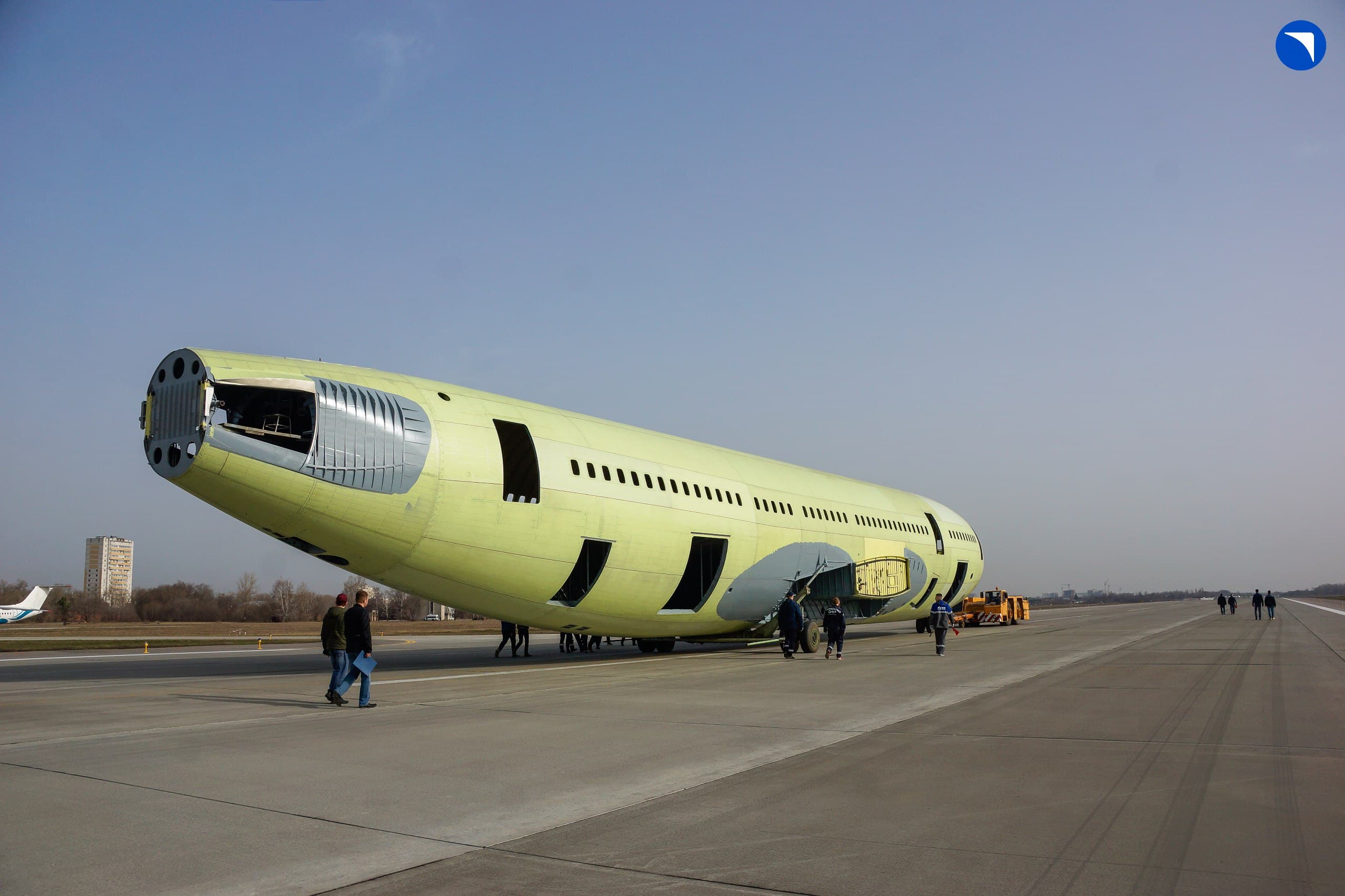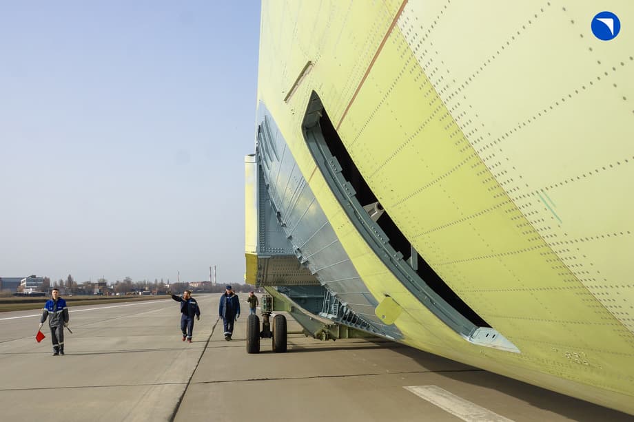 Восемнадцатитонный фюзеляж был отбуксирован на технологических шасси, позволяя будущему лайнеру «почувствовать» взлетную полосу заводского аэродрома.