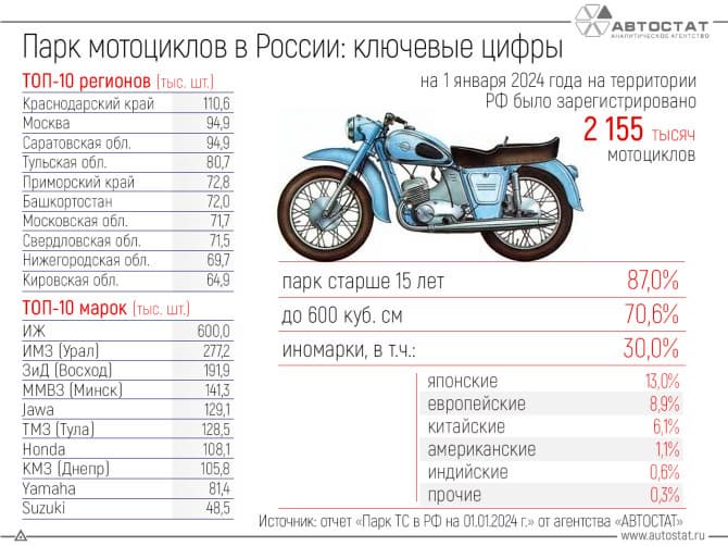 При этом стало известно, что 87% процентов от всех мотоциклов старше 15 лет. Треть из них приходится на иномарки, среди которых лидируют японские, китайские и европейские модели. Почти две трети (70,6%) от всех мотоциклов обладают двигателем не менее 600 куб. см.
