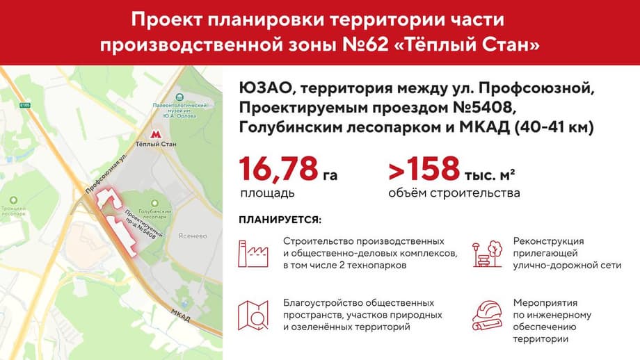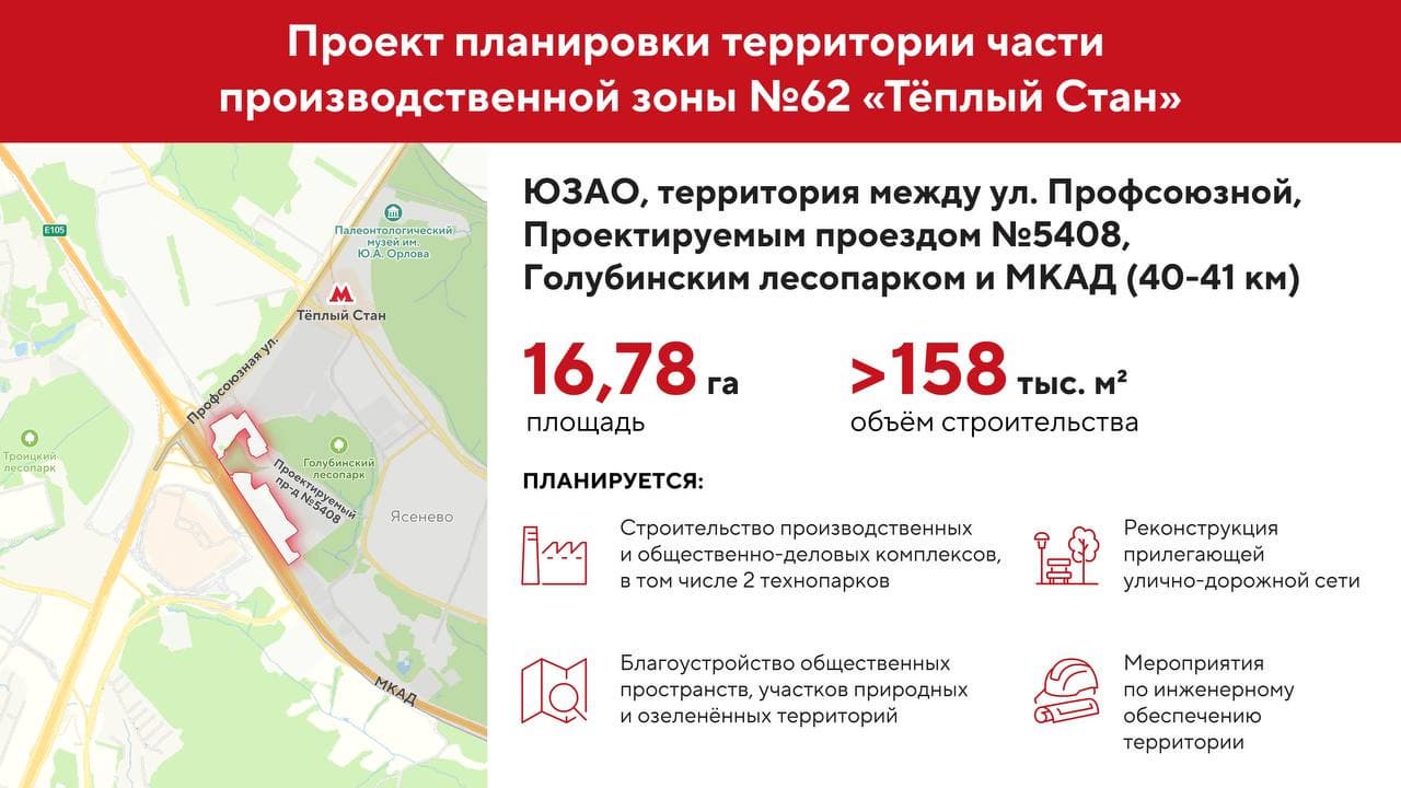 Власти Москвы реорганизуют часть промзоны «Теплый Стан» по программе комплексного развития территорий, об этом в своем телеграм-канале сообщил мэр Москвы Сергей Собянин.