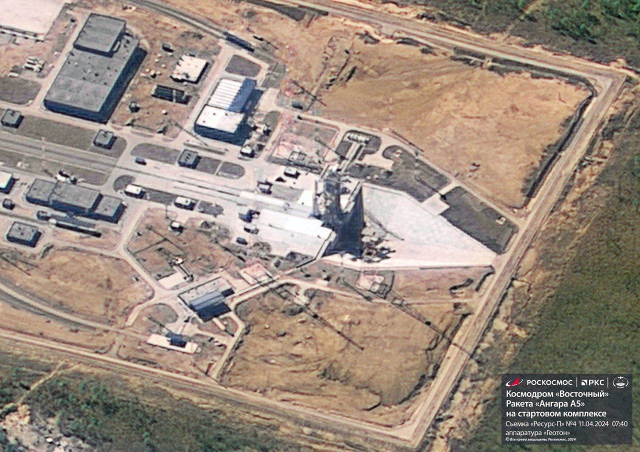 А вот так «глазами» «Ресурса-П» выглядела перед запуском с Восточного тяжелая ракета «Ангара-А5» на стартовом комплексе.