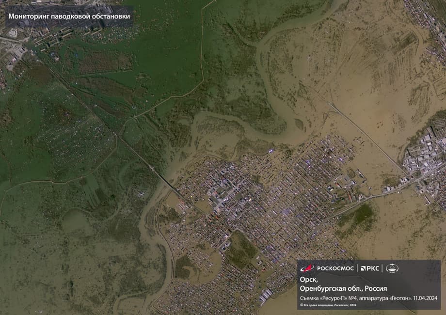 Над Россией он помогает следить за территориями, куда пришли паводки и наводнения. Вот так 11 апреля выглядела часть Орска в Оренбургской области. Вода уходит после того, как близлежащую к городу дамбу прорвало и были эвакуированы более двух тысяч человек.
