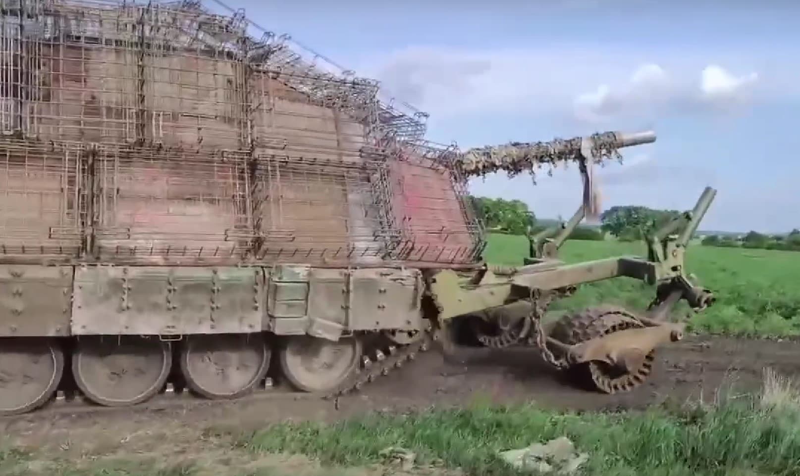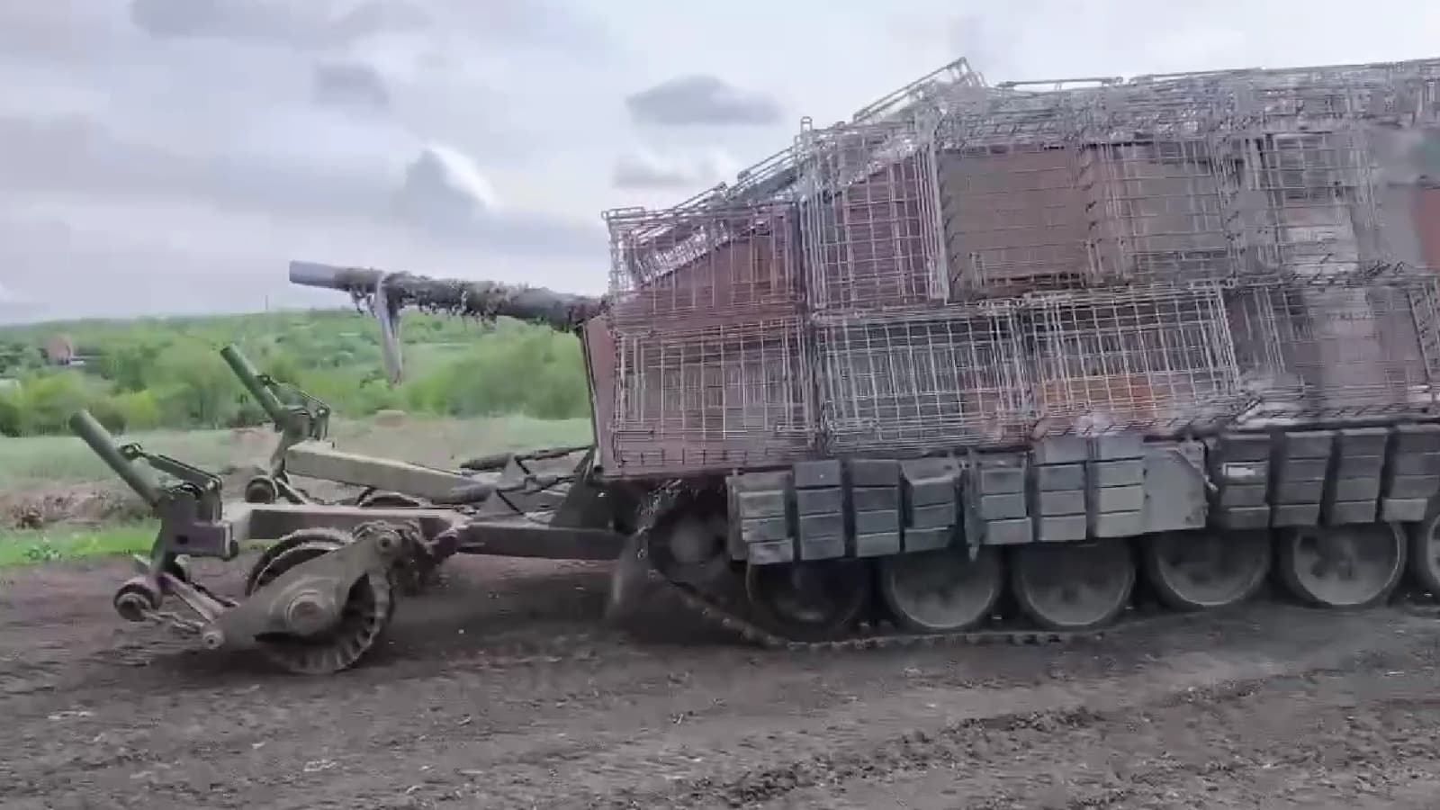 В российских войсках появились танки Т-72 с усиленной защитой типа «дикобраз». Металлические сетчатые конструкции защищают от FPV-дронов противника. Кроме того, в передней части танка размещено оборудование машины разминирования для преодоления минных заграждений.