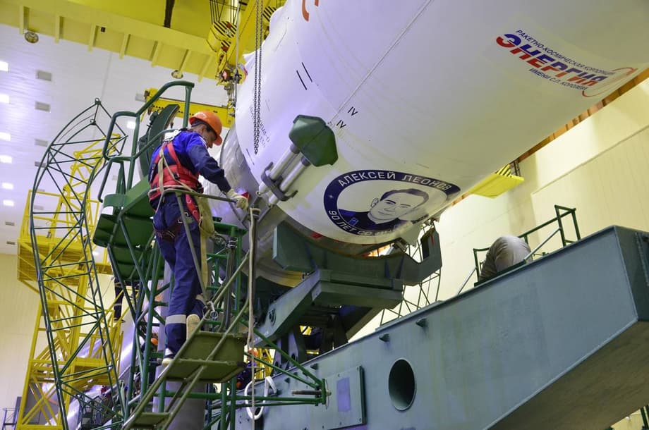 Ракета-носитель в этот раз не совсем обычная. Ее украсили изображениями, связанными с юбилярами-персонами и юбилярами-событиями из космической истории России. Так, на «Союзе» можно увидеть изображение первого человека, который совершил выход в открытый космос: Алексея Леонова. В этом году исполняется 90 лет с его рождения.