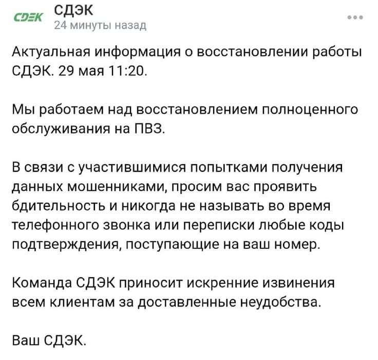 В пресс-службе СДЭК заверили, что работают над восстановлением полноценного обслуживания клиентов на пунктах выдачи заказов (ПВЗ). Клиентов предупредили об участившихся случаях мошенничества, когда злоумышленники по телефону пытаются получить коды подтверждения для получения отправлений.