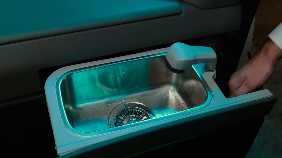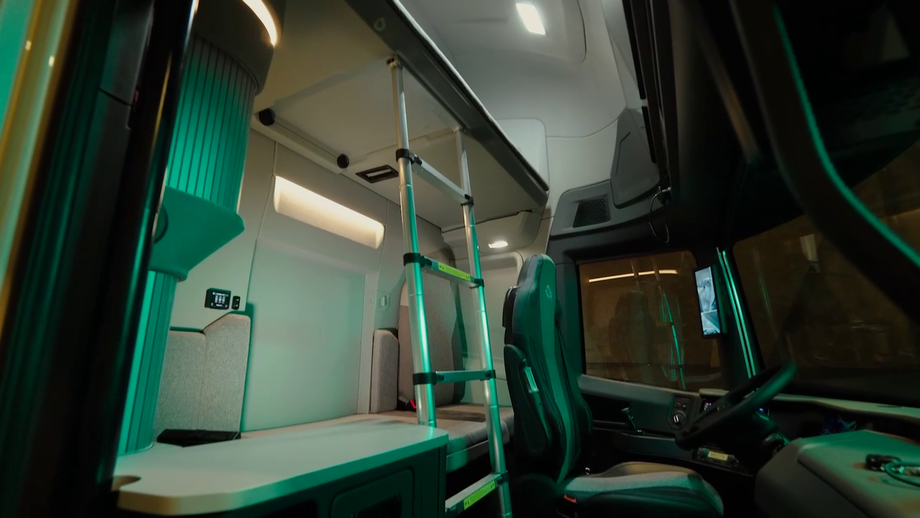 Кресло в грузовике положено только водителю. Есть два увеличенных спальных места, откидные столики и кухонная техника: чайник, кофемашина, мультиварка и микроволновая печь. Умыться в тягаче можно не выходя из машины. Для удобства есть небольшая раковина с краном.