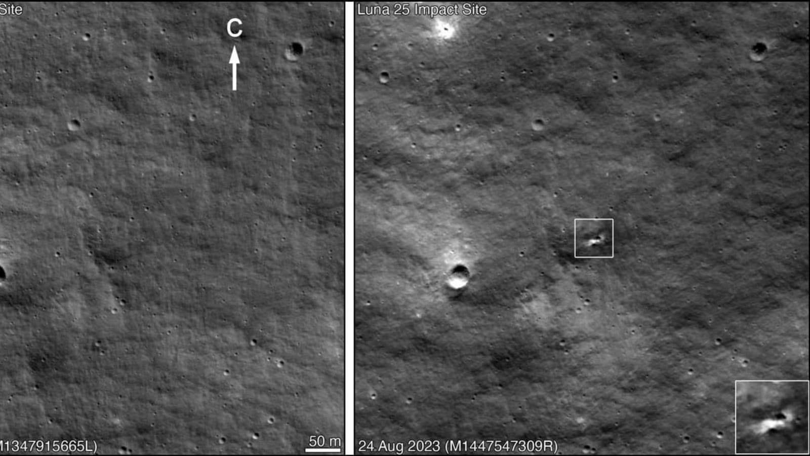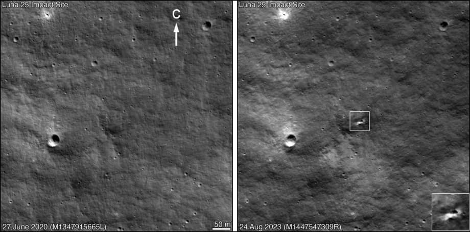 На фото видно, что новый кратер находится на внутреннем склоне более крупного кратера диаметром около 40 км. По данным НПО им. С.А. Лавочкина, посадочный блок «Луны-25» имел массу 1605 кг в заправленном виде. Аппарат до удара израсходовал часть топлива, и по экспертным оценкам, его масса снизилась до 600–1000 кг. По расчетам авторов, удар произошел под углом 45 градусов, а максимальная скорость при ударе составляла 1,7 км/с.