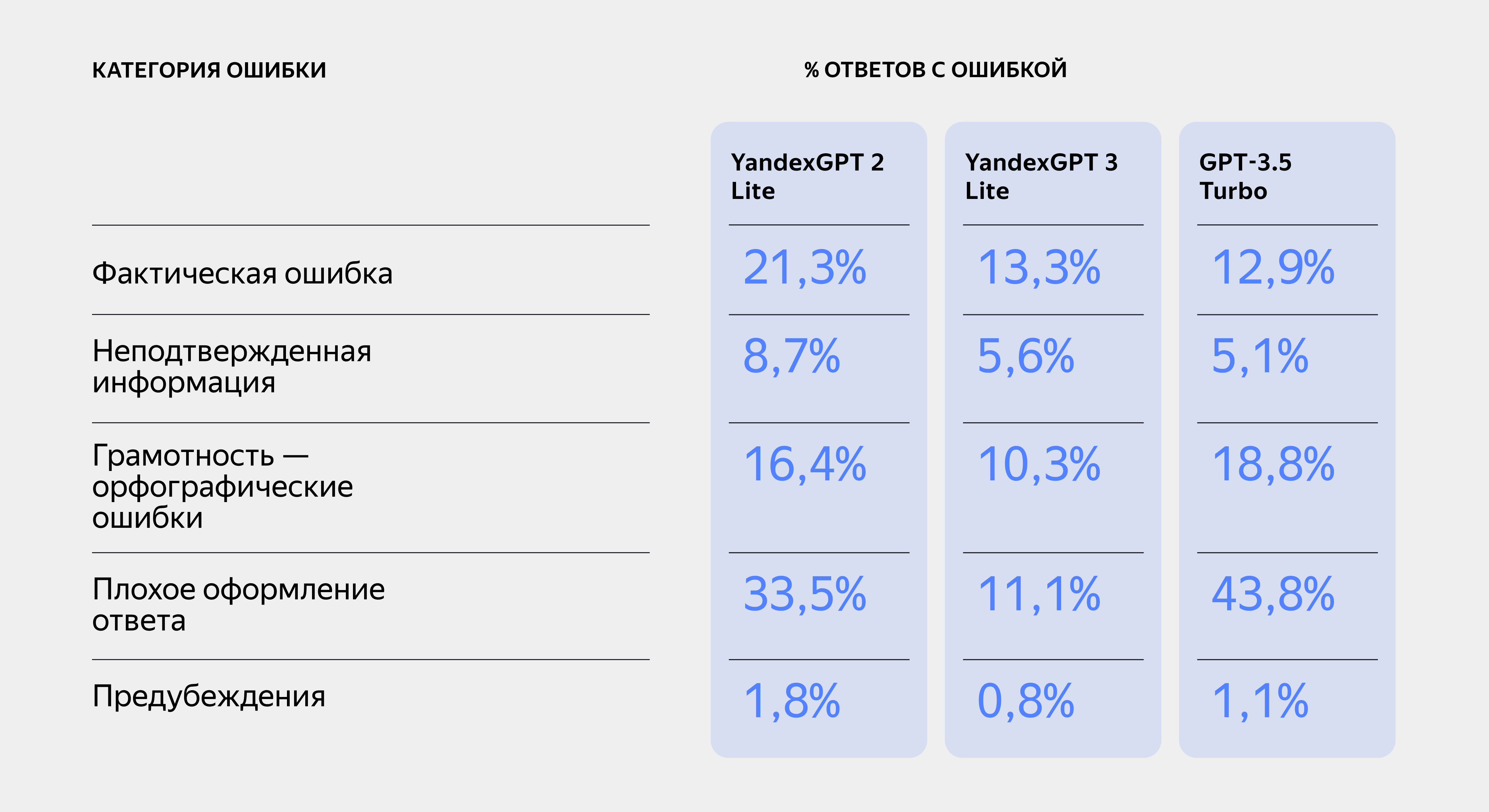 Кроме того, YandexGPT 3 Lite допускает меньше орфографических ошибок.