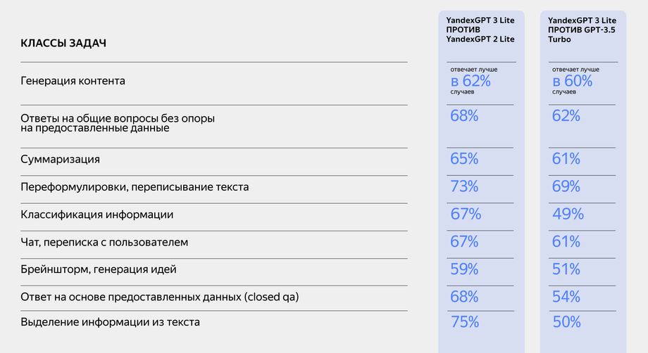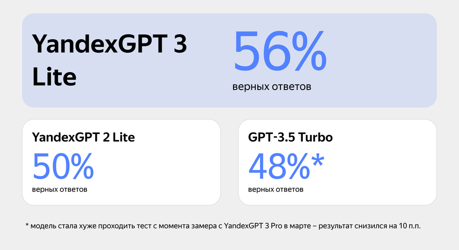 Новая версия нейросети превосходит YandexGPT 2 Lite (второе поколения). По итогам тестирования YaMMLU_ru (русскоязычной версии международного эталонного теста MMLU) YandexGPT 3 Lite дает на 6% больше верных ответов.