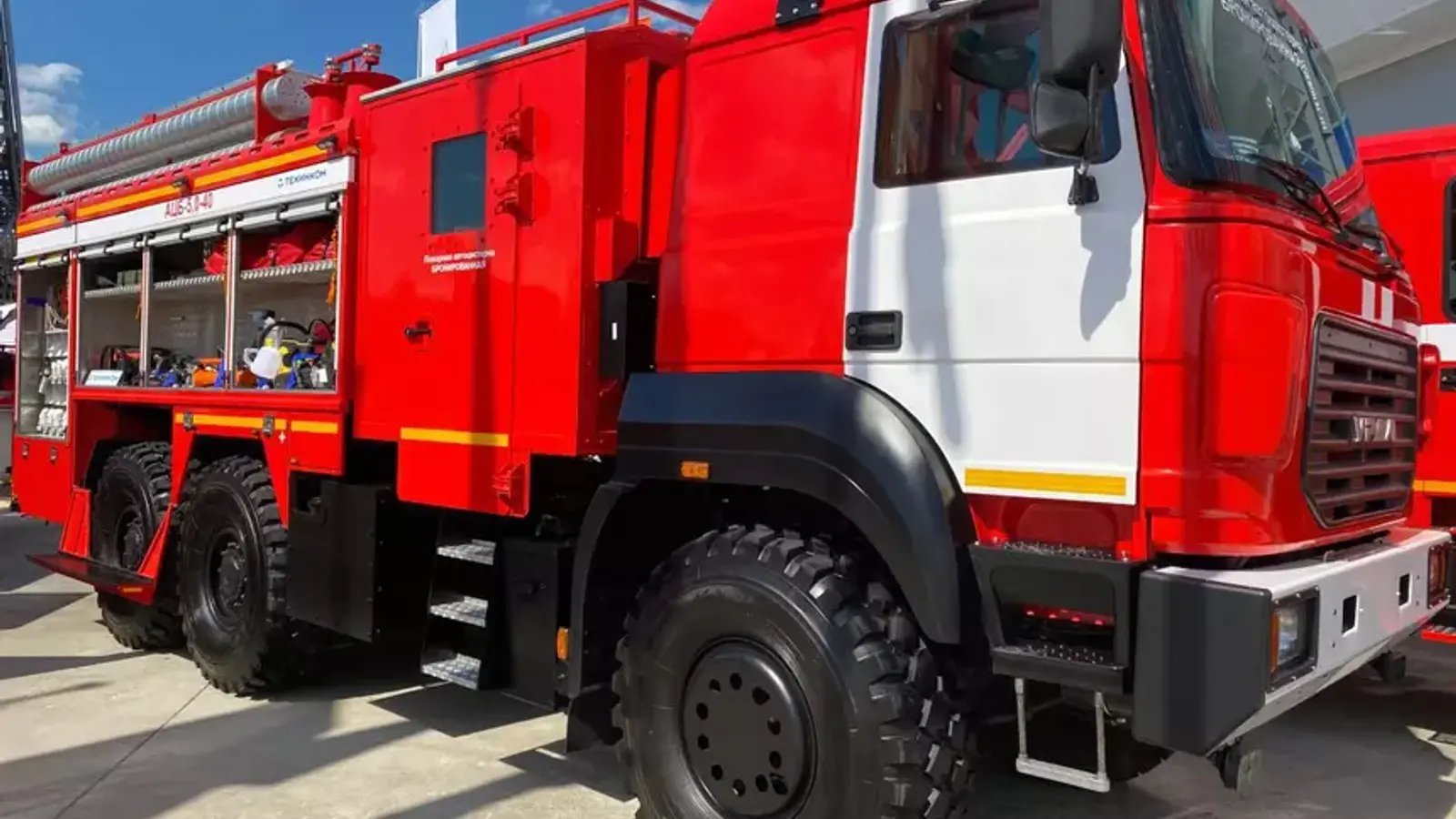 Борт бронированной пожарной машины вмещает 5000 литров воды и 360 литров пенообразователя. Это делает ее эффективной при ликвидации пожаров на критически важных объектах, где есть угроза жизни и здоровью человека.