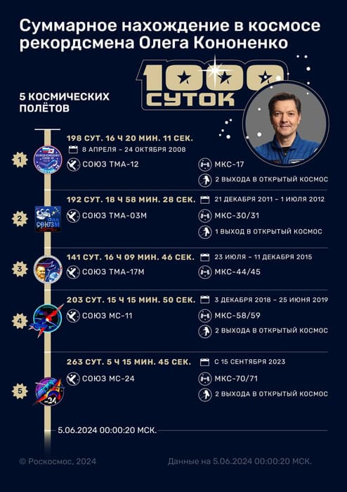 Командир отряда космонавтов «Роскосмоса» Олег Кононенко и по совместительству специальный корреспондент ИА «ТАСС» на МКС в 00:00:20 по московскому времени провел суммарно ровно тысячу суток в космосе. Он сделал это первым в мире.