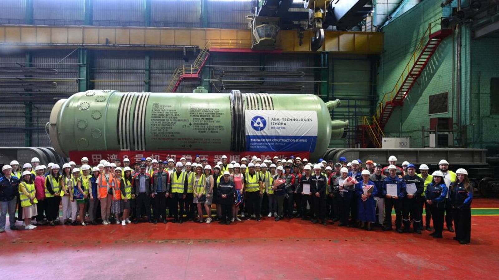 На АЭС «Тяньвань», которая строится по российскому проекту и станет самой крупной в мире после окончания работ, отправился компенсатор давления для восьмого энергоблока АЭС. Он предназначен для обеспечения необходимого давления в первом контуре реактора. В собранном состоянии его длина составляет около 14 метров при диаметре 3,3 метра. Вес аппарата — 186 тонн.
