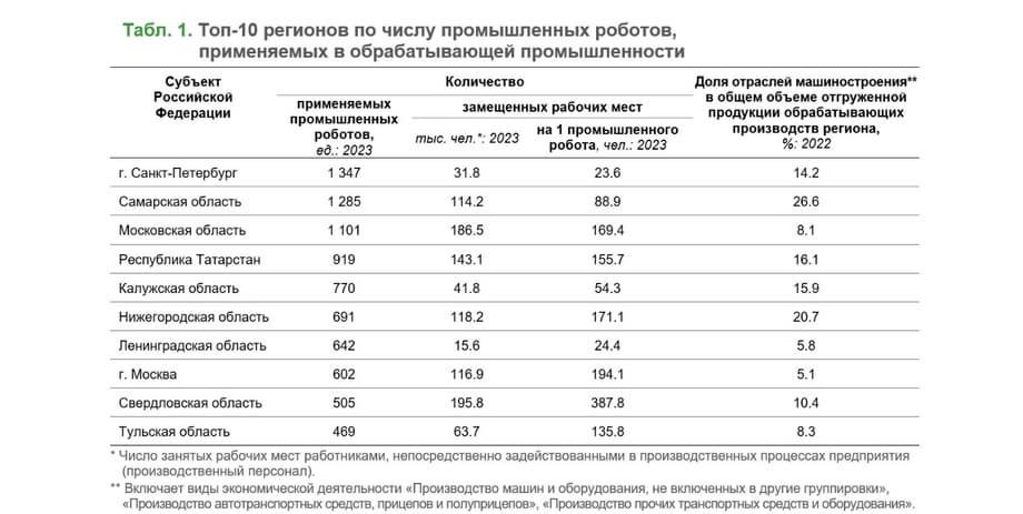 В Северной столице в обрабатывающей промышленности заняты 1,3 тыс. роботов. Многие из них задействованы на 3 автомобильных заводах. На втором месте находится Самарская область, на третьем — Подмосковье, на четвертом — Татарстан. Пятерку замыкает Калужская область.