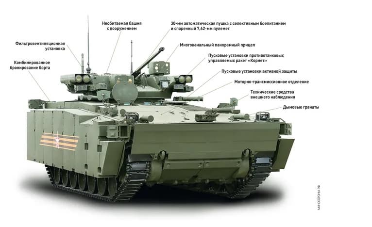 Боевая масса машины — порядка 25 - 27 т при наличии амфибийных возможностей и десантном отделении на 8 человек.