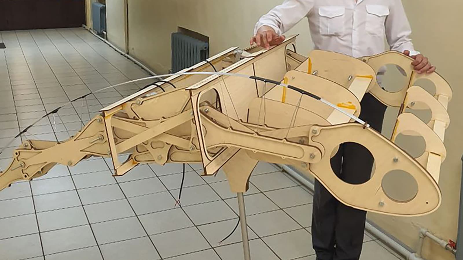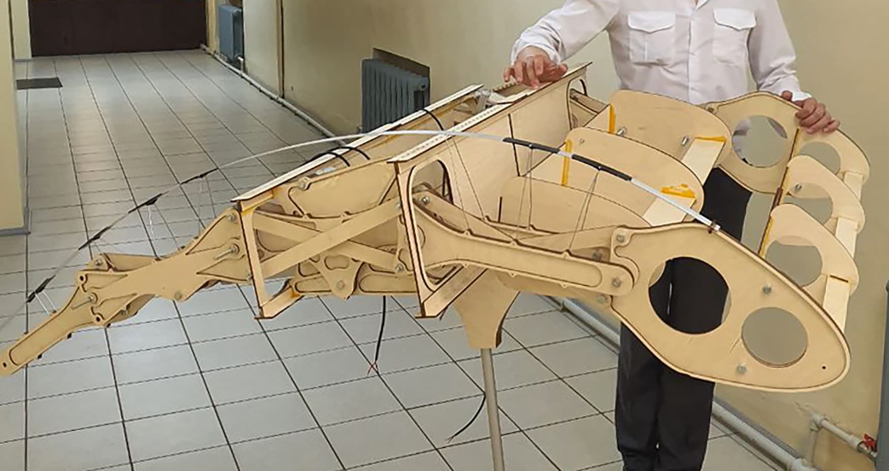 Испытания показали, что при изменении кривизны профиля крыла угол между носовым и хвостовым сегментами механической цепи может достигать 80°.
