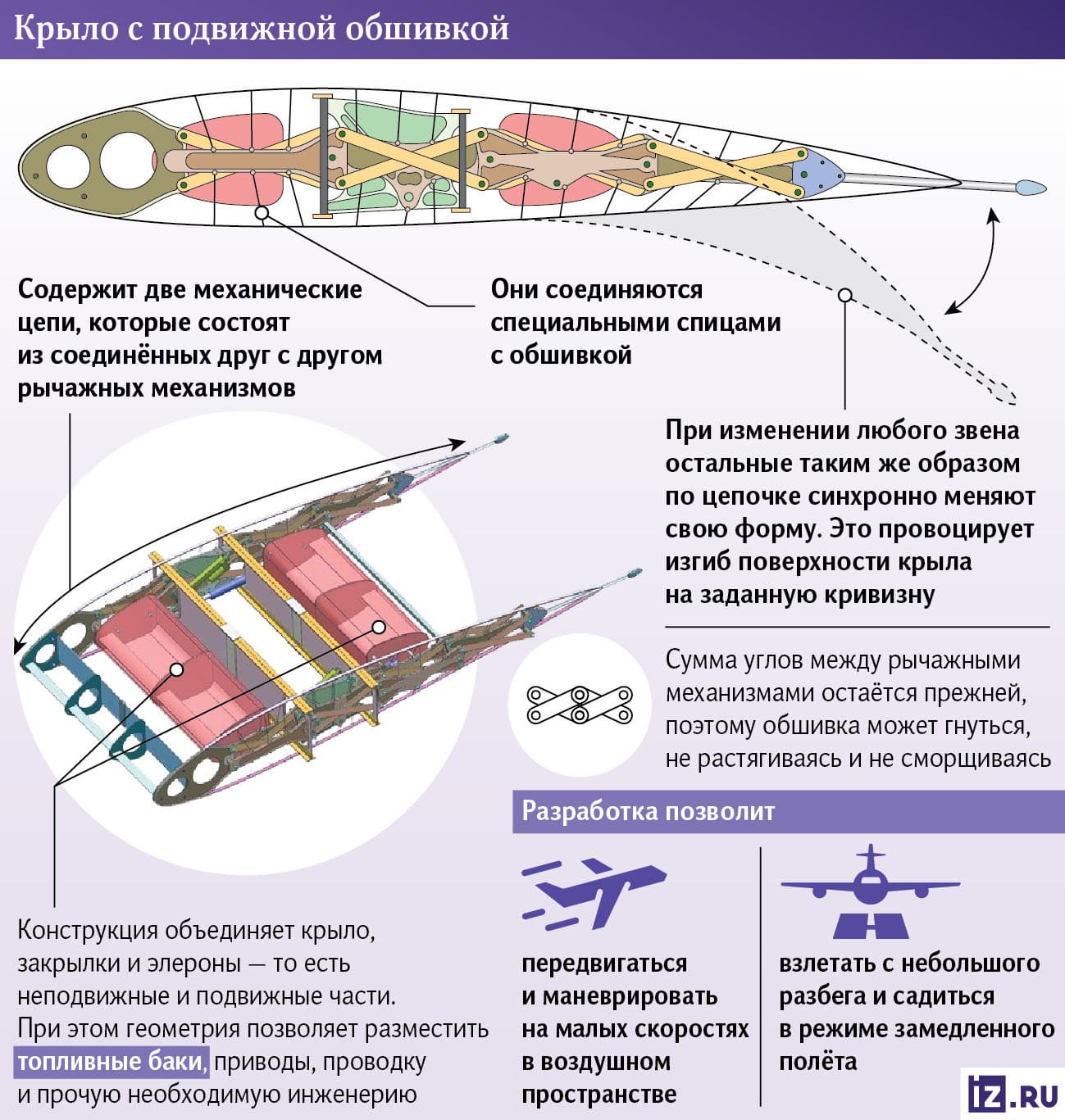 Как отмечают «Известия», новый механизм позволяет поверхности перемещаться вокруг силовых конструкций крыла, но при этом оставаться гладким, чтобы сохранять высокие аэродинамические свойства. Так пилот или командное «умное» устройство воздушного судна могут управлять режимами полёта, трансформируя форму его крыла.