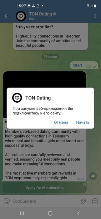 Пользователям Telegram стал доступен сервис знакомств Ton Dating. Приложение запустили в мессенджере 18 июня этого года. Об этом сообщили в Телеграм-канале приложения.