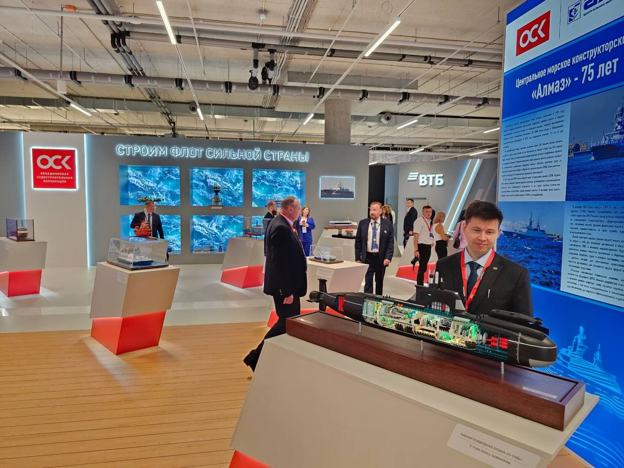 На стенде представлено 38 макетов, в том числе универсального обитаемого подводного аппарата «Ясон» ( строится на площадке АО «ПО Севмаш»), подводной лодки проекта 636 «Варшавянка» с комплексом Club-S и «Амур 1650» («Адмиралтейские верфи»), многоцелевого фрегата проекта 22356 (разрабатывается специалистами АО «Северное ПКБ»), сторожевого корабля проекта 11356 «Буревестник» ( «Прибалтийский судостроительный завод "Янтарь"»), малого сторожевого корабля проекта 20382 («Центральное морское конструкторское бюро "Алмаз"»), атомного ледокола проекта 22220 «Урал» (Балтийский завод) и других.
