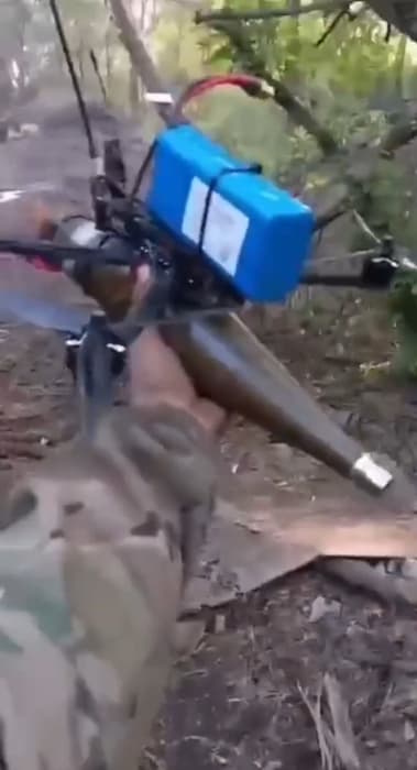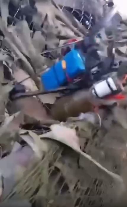 Ударный дрон со снарядом врезался в противокумулятивный козырек, но не сдетонировал. Танкисты аккуратно извлекли коптер с моноблочной кумулятивной боевой частью из деформированных прутьев решетчатого противокумулятивного козырька, чтобы исключить активацию контактного взрывателя боеприпаса.
