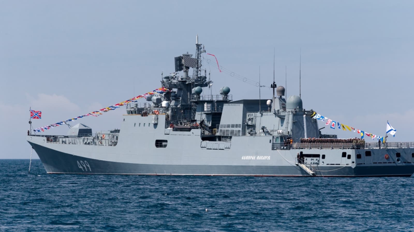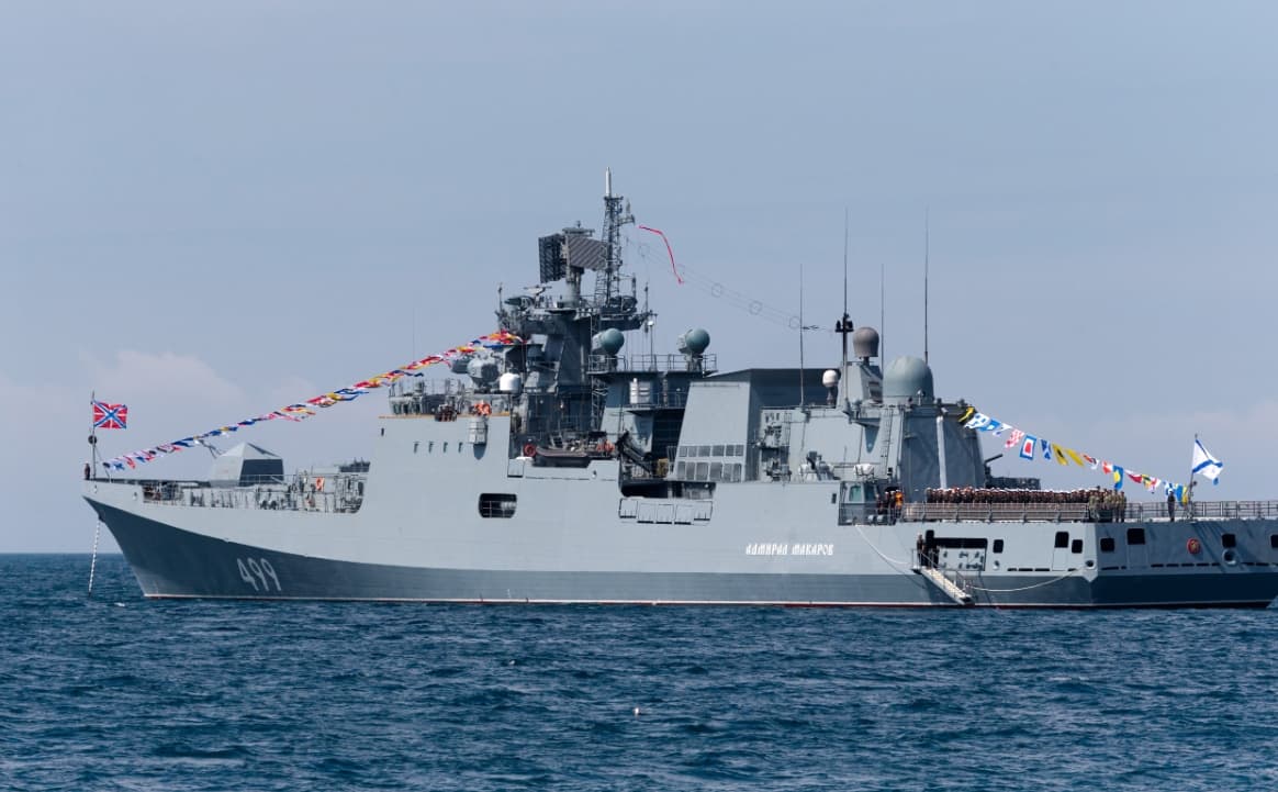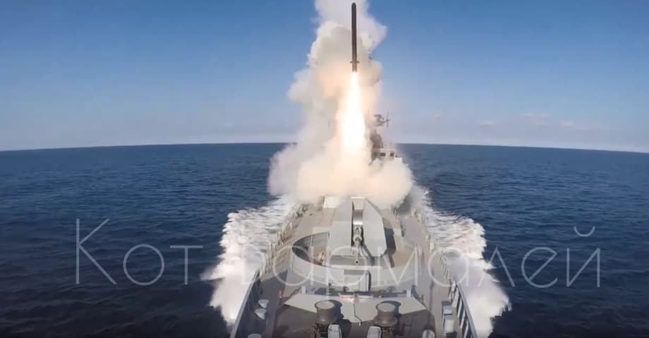 Российские моряки выполнили пуск стратегической крылатой ракеты 3М14Т «Калибр-НК» из универсальной вертикальной пусковой установки комплекса 3С14У1 фрегата проекта 11356 «Адмирал Макаров».