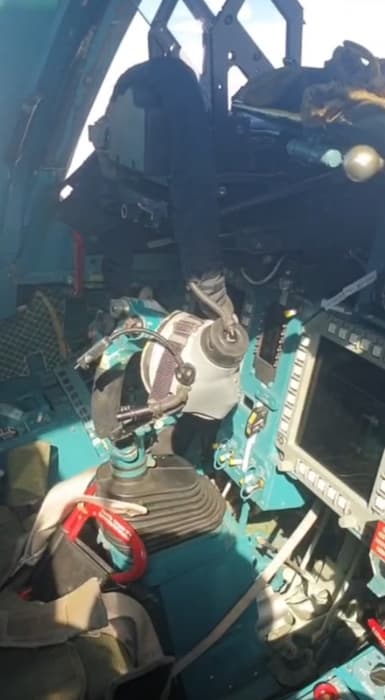 В Сети появились кадры полета российского фронтового бомбардировщика Су-34 в беспилотном режиме. Кресла пилота и штурмана пусты, кислородная маска летчика висит на прицеле, за окнами – облака, самолетом никто не управляет.