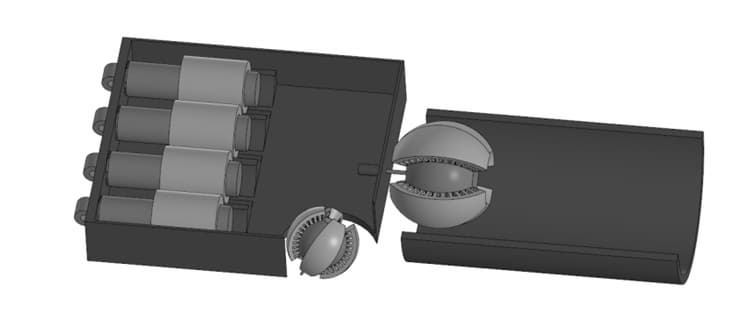 Мы сформировали свой вариант расположения предлагаемых двигателей в корпусе протеза: цилиндрические и линейные двигатели предполагается использовать для движения четырех пальцев, а сферические – для кисти и большого пальца. Затем мы провели расчеты и представили схему компоновки электропривода протеза.