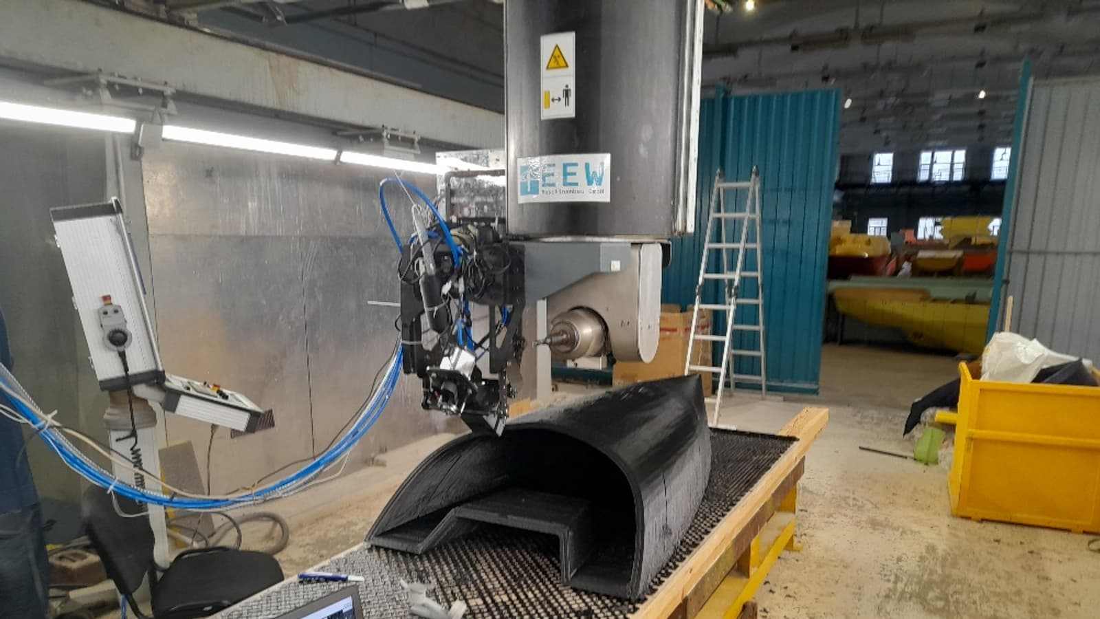 Современные массовые модели принтеров существенно ограничены в объеме и могут создавать конструкции габаритами около 1х1 метр, что явно недостаточно для печати натурных корпусов достаточно крупных размеров. В качестве основы был использован уникальный 5-координатный фрезерный станок с числовым программным управлением, который используется в КГНЦ для обработки моделей судов и имеет рабочий объем размером до 12*3*1,75 метра.