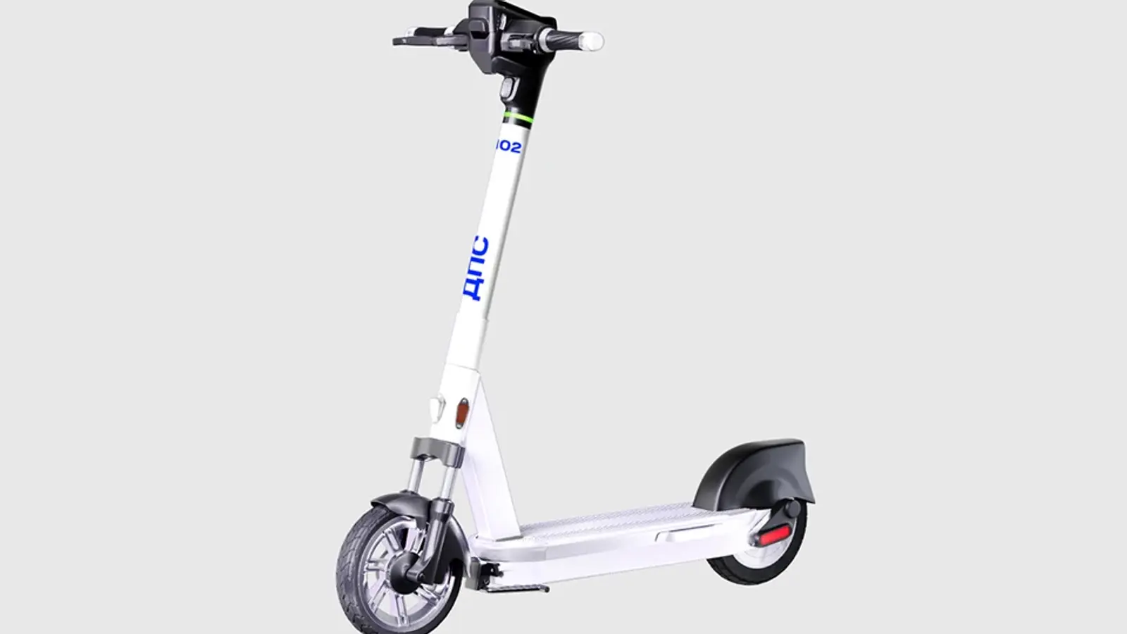 Самокаты модели Ninebot S90L белого цвета с надписью “ДПС” оснащены поворотниками, двумя дашбордами и другими улучшенными характеристиками безопасности.