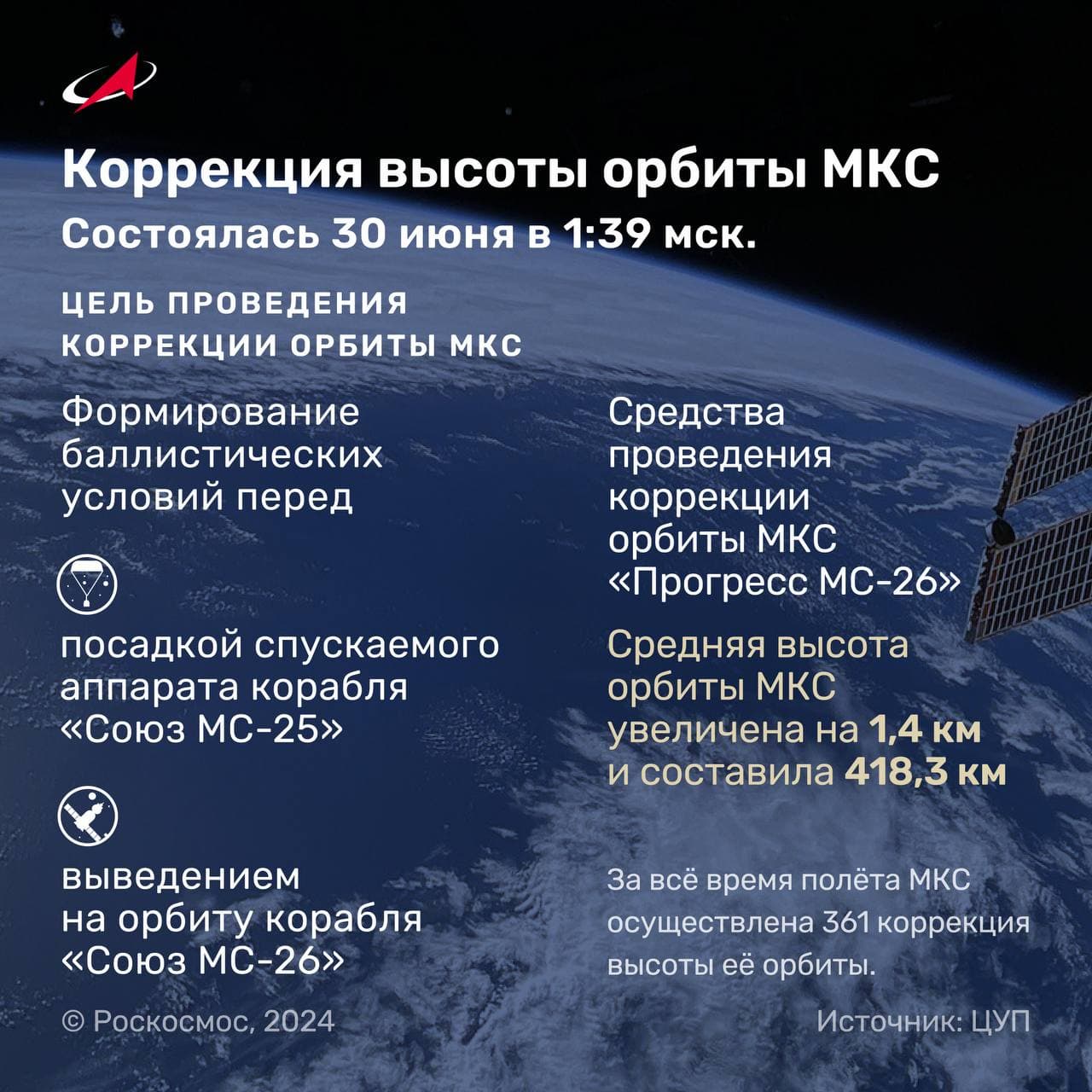 По сообщению «Роскосмоса», в 01:39 мск включились двигатели «Прогресса МС-26», которые проработали 536 секунд, выдав импульс величиной 0,78 м/с. В результате средняя высота орбиты станции увеличилась на 1,36 км и составила 418,25 км над поверхностью Земли.