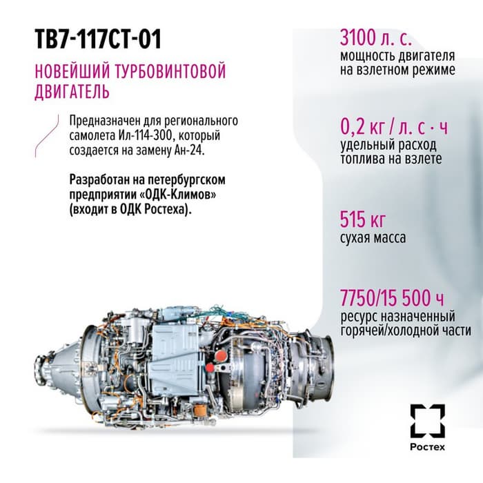 Ил-114-300 получил отечественный турбовинтовой двигатель от ОДК под названием ТВ7-117СТ-01. После доработки и усиления, как отмечают его создатели, двигатель превосходит зарубежные аналоги.