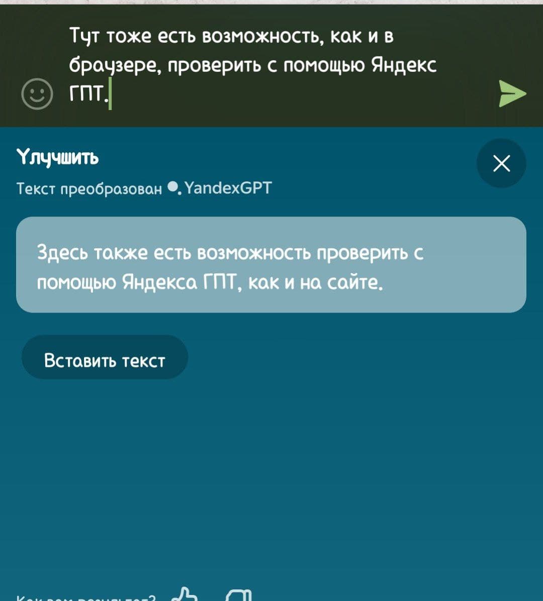 YandexGPT сделает текст человечнее, эмоциональнее, и даже подберёт подходящие эмодзи. А если пользователь допустил ошибки при наборе заметок, сообщений, постов в соцсетях или деловых писем, эта большая языковая модель их уберёт.