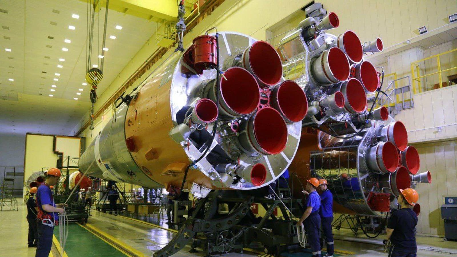 «Пакет» под пилотируемый пуск представляет собой первую и вторую ступени ракеты. Это пять блоков: центральный и четыре боковых.