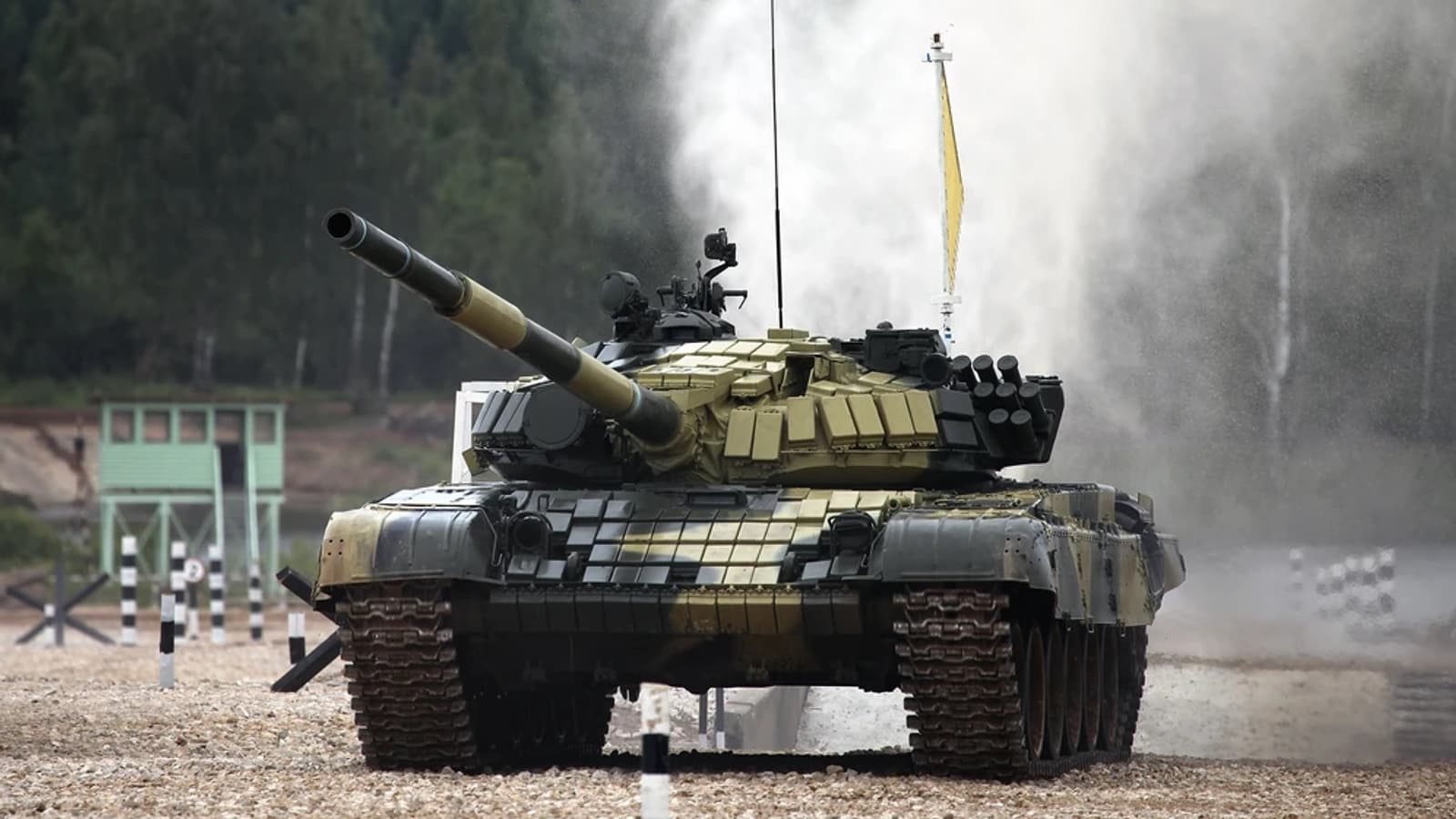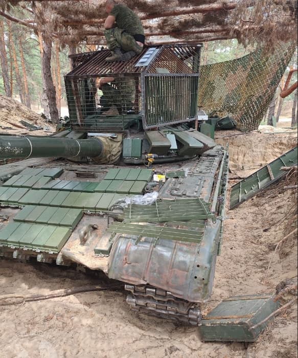 Российские танки Т-72 образца 1979/80 годов выпуска получили дополнительные комплекты развитой импровизированной защиты от бронебойных оперённых подкалиберных и кумулятивных снарядов.