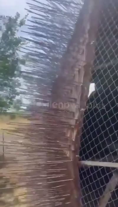 Российские военные на передовой соорудили специальную защиту для бронетранспортера, который представляет собой ангар дугообразной формы. Стенки ощетинились острой арматурой размером до 25 сантиметров.