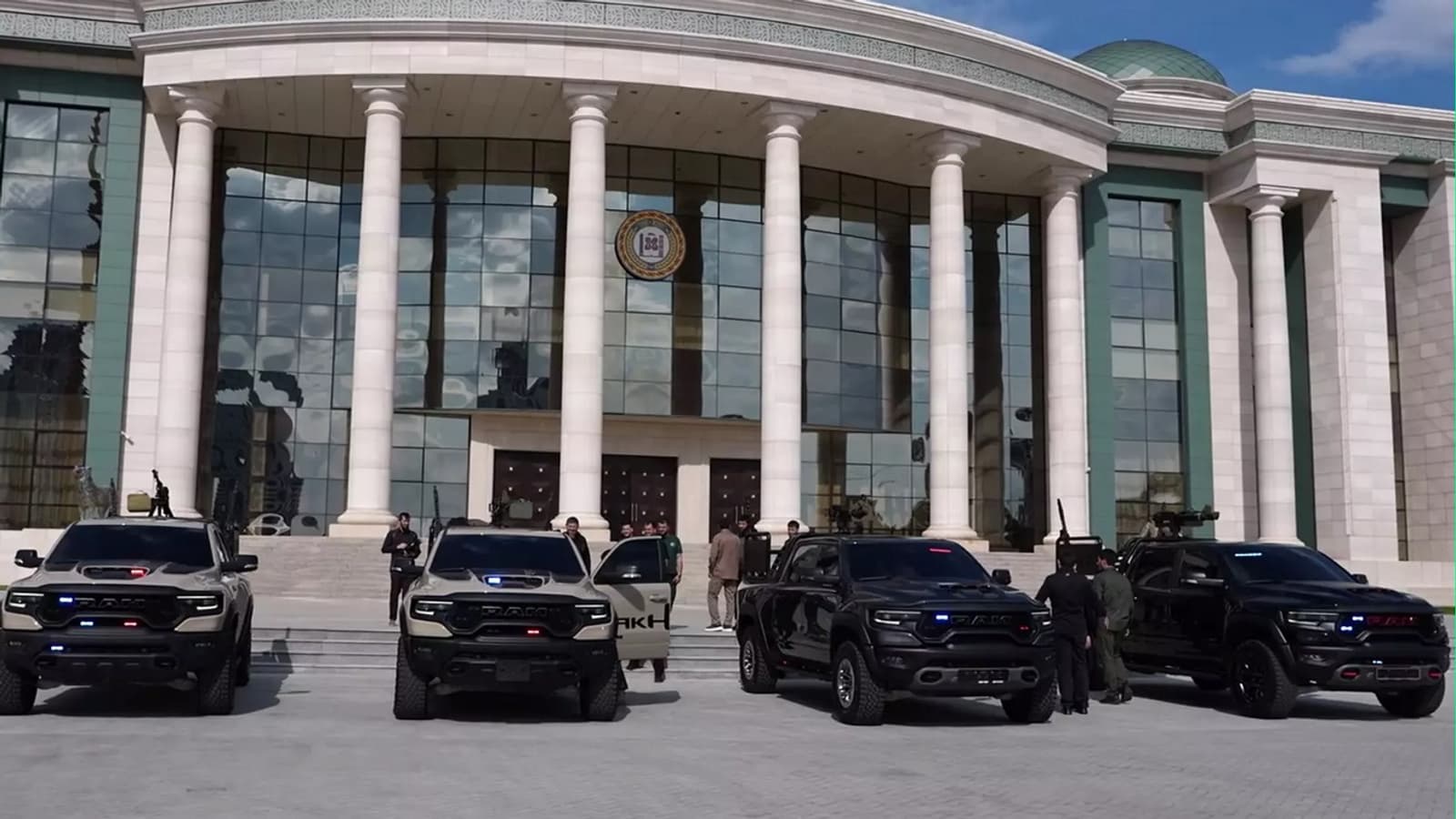 Автопарк спецслужб Чечни пополнился американскими пикапами Dodge Ram. Грузовики оборудованы красно-синими спецсигналами, стрелковым оружием в кузове и наглухо затонированы.