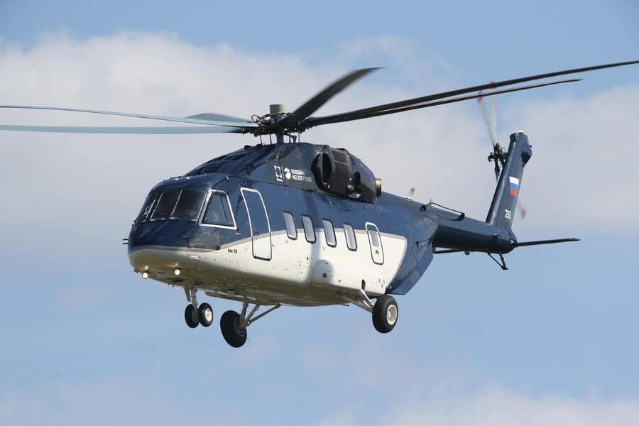 В Сети обсуждают тяжёлый российский вертолёт Ми-38, который называют за необычный окрас и за значительную выносливость «Воздушной касаткой».