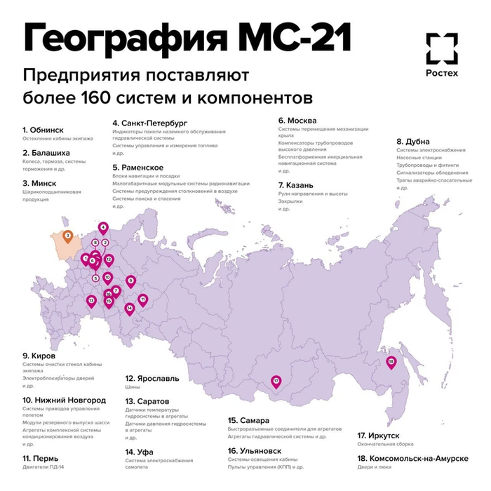 Над созданием компонентов импортозамещённого самолёта работают 56 основных поставщиков плюс порядка 20 тысяч предприятий задействованы в кооперации по всей России.