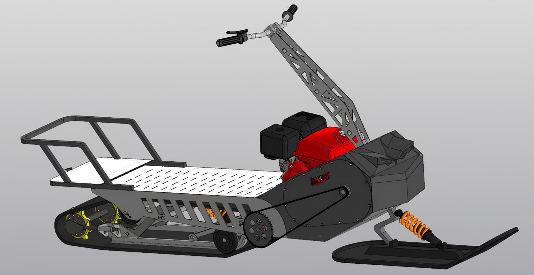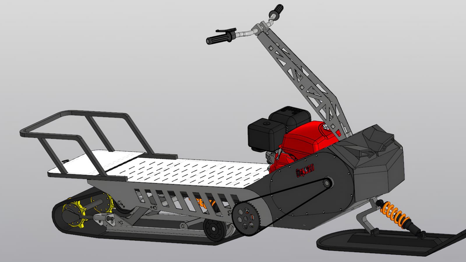 Специалисты разработали уникальную двухрычажную склизовую систему подвески для повышения проходимости и маневренности. В разработке также применят модульную конструкцию. Она позволит перевозить могоснегокат в автомобиле. За счет быстроразъемных соединений транспортное средство можно будет собрать за 10-15 минут.