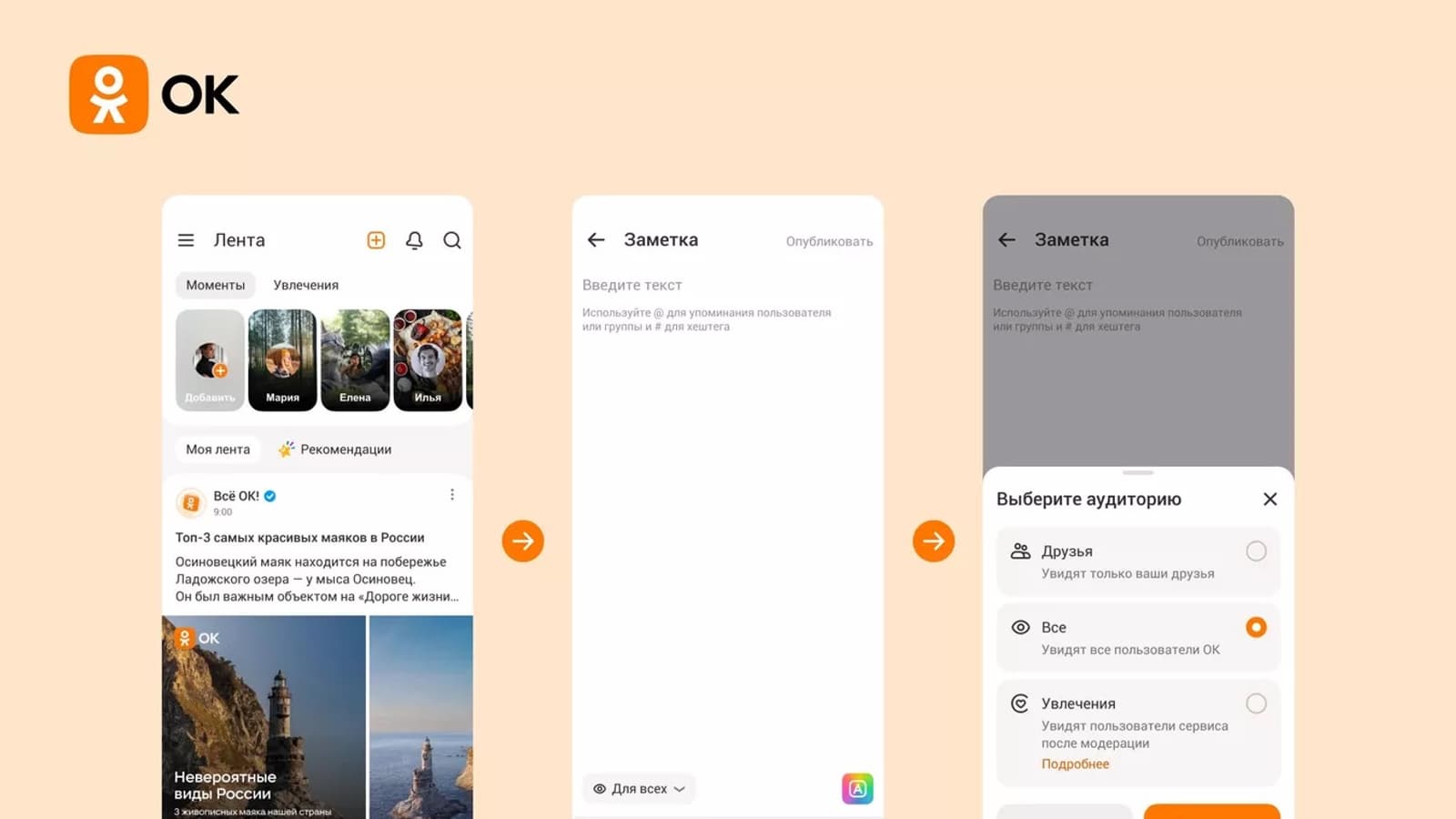 Новая система объединяет все настройки приватности публикаций, включая возможность размещения заметок в сервисе «Увлечения». Для этого необходимо выбрать соответствующий параметр при публикации — после модерации и проверки редакторами ОК запись появится в сервисе и станет доступна его пользователям. Эта опция подойдёт для публикаций, связанных с хобби, которые предназначены для широкой аудитории с похожими интересами. Это обеспечит публикациям больший отклик и позволит пользователям получать обратную связь и рекомендации от единомышленников.