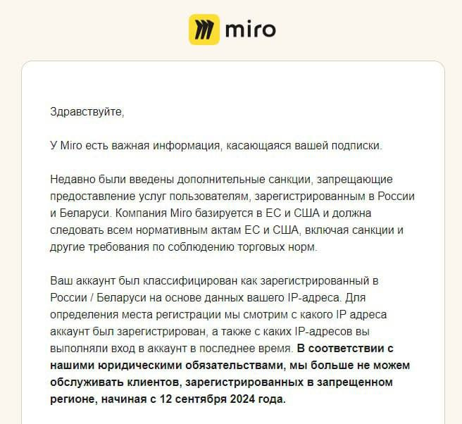 Платформа для совместной работы Miro сообщила своим пользователям в России и Белоруссии о прекращении предоставления услуг с 12 сентября 2024 года. Пользователи Miro из России и Белоруссии получили уведомление по электронной почте, в котором подробно изложены условия блокировки аккаунтов. Согласно информации, платформа будет блокировать учетные записи, зарегистрированные на IP-адреса из этих стран.