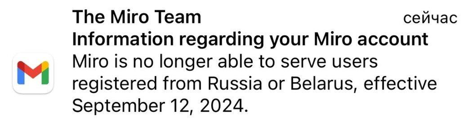 Miro, платформа для совместной работы, объявила о прекращении предоставления услуг пользователям в России и Белоруссии с 12 сентября 2024 года из-за санкций, введенных США.