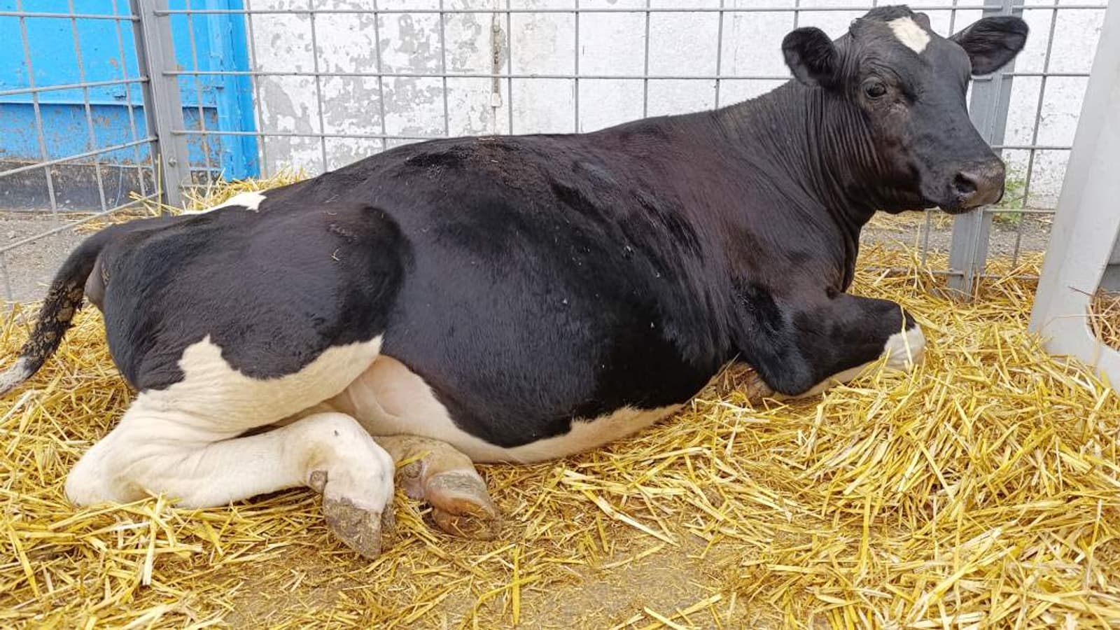 Звездочка, как и положено детенышу, ведет себя активно: пытается бодаться и топчется по настилу. Она родилась весной на ферме под Краснодаром и сейчас весит около 200 кг.