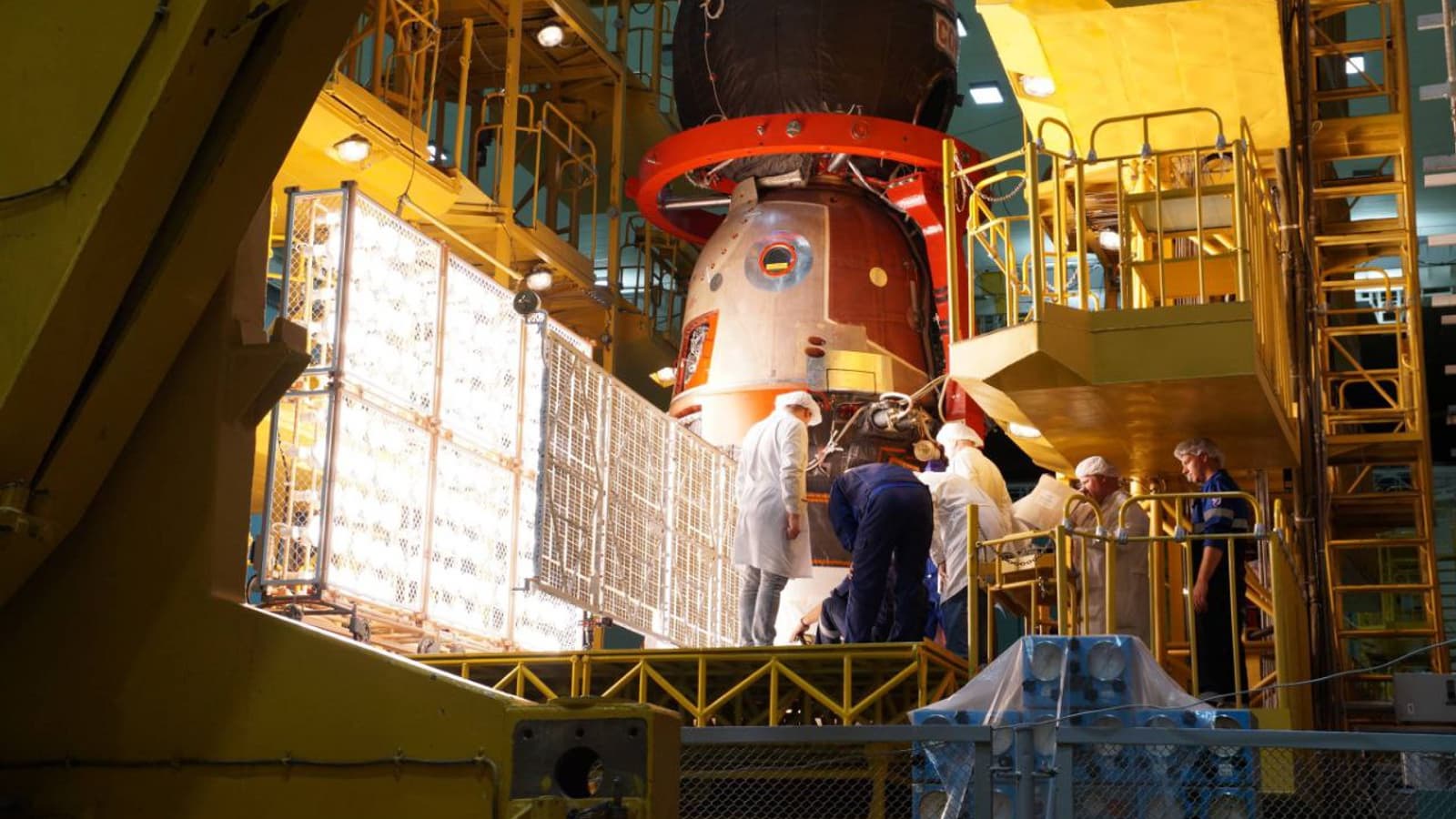 Кроме того, завершаются и другие предпусковые работы. Идёт установка специального оборудования и снаряжения в спускаемом аппарате и бытовом отсеке.