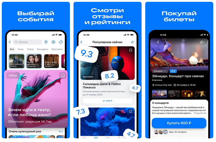 VK запустила бета-версию сервиса «Билеты», где можно купить билеты в кино, на концерты, спектакли, выставки и другие события.